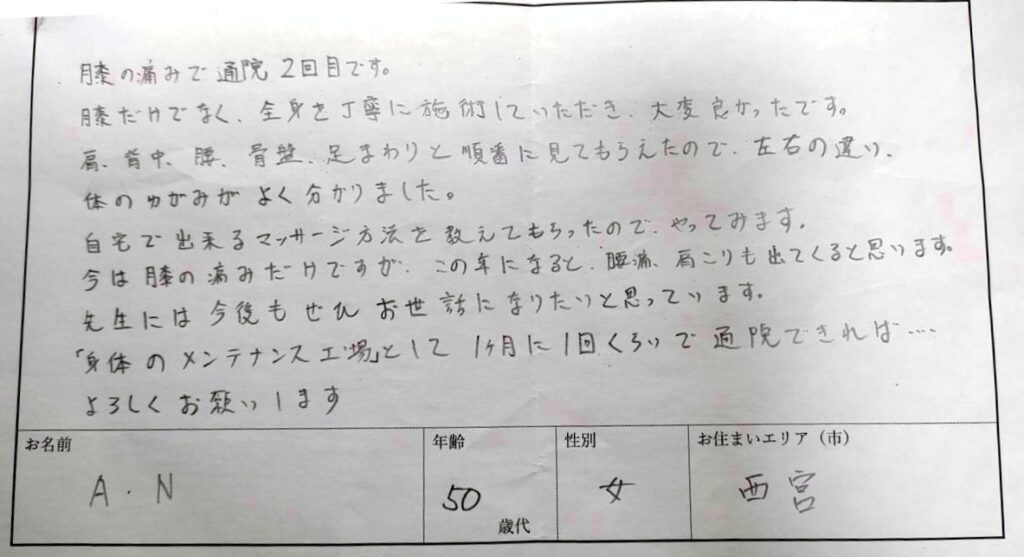 後はお伝えした完治のゴールに向けてご自分でできることを進めていき、定期的に確認と施術を受けていただければと思います。